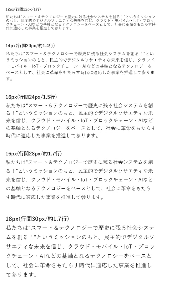 ひらがなやカタカナが多い文、漢字が多い文、英字でも見やすい行間は異なりますし、文章が入るブロックの大きさによっても変わってきます。