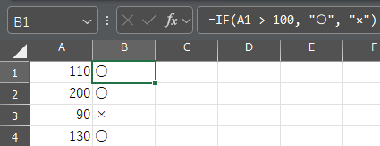 例えば、以下画像の表で100を超える値の場合は「○」を表示、それ以外の場合は「×」を表示したい場合、以下の式になります