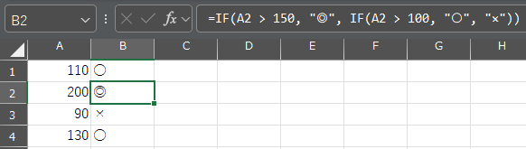 =IF(A1 > 150, "◎", IF(A1 > 100, "○", "×"))