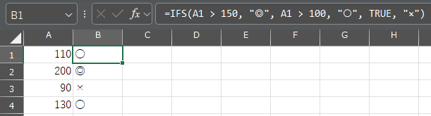 =IFS(A1 > 150, "◎", A1 > 100, "○", TRUE, "×")