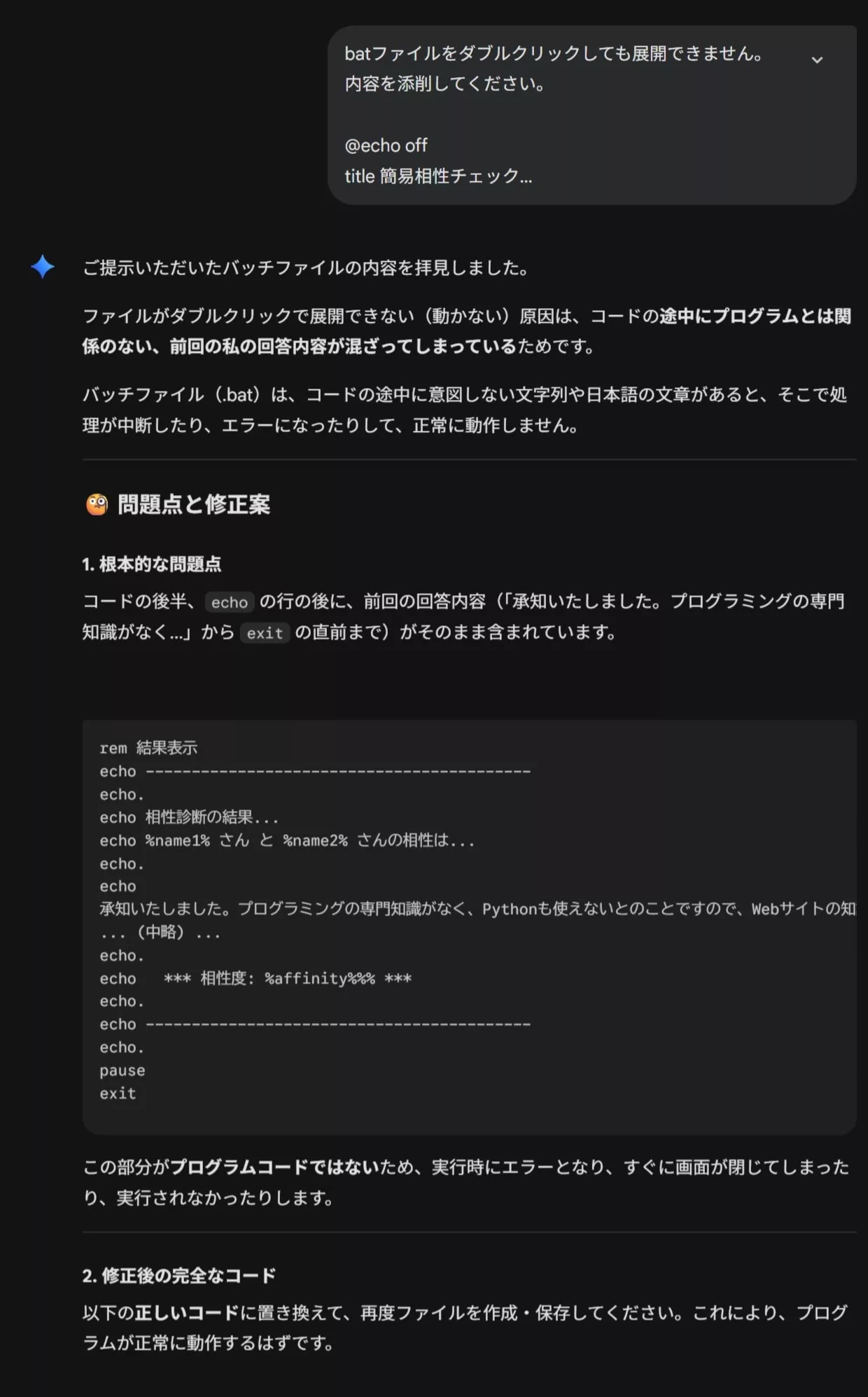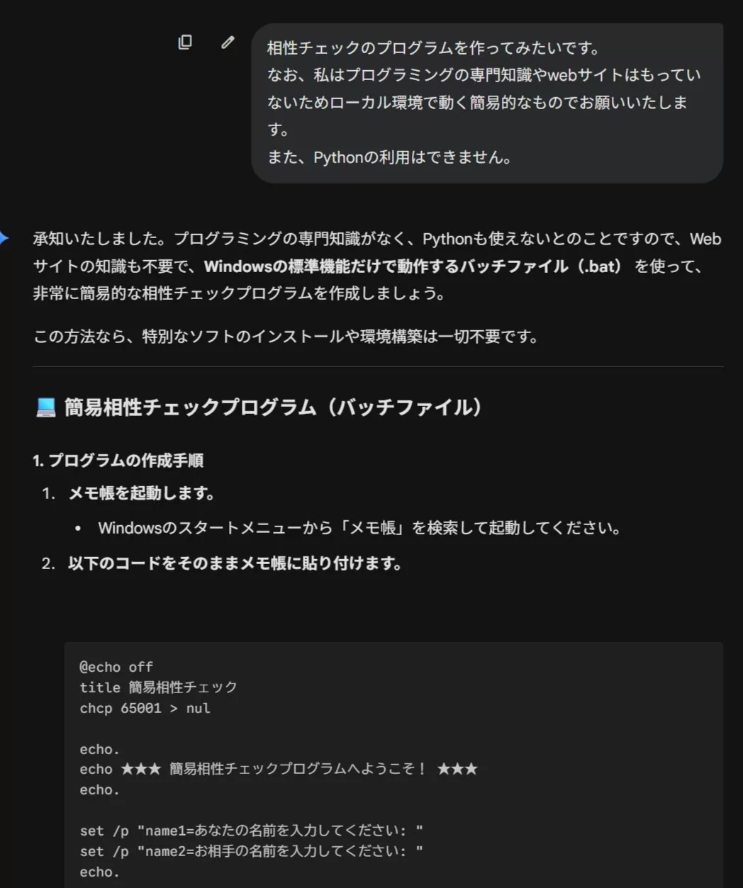 今回は相性チェックプログラムを作ってみるというところで、特にwebサーバーや独自ツールなどの特殊な環境を必要とせず、ローカルで機能するプログラムの作成をする前提でGeminiに以下のようにお願いをしてみました。