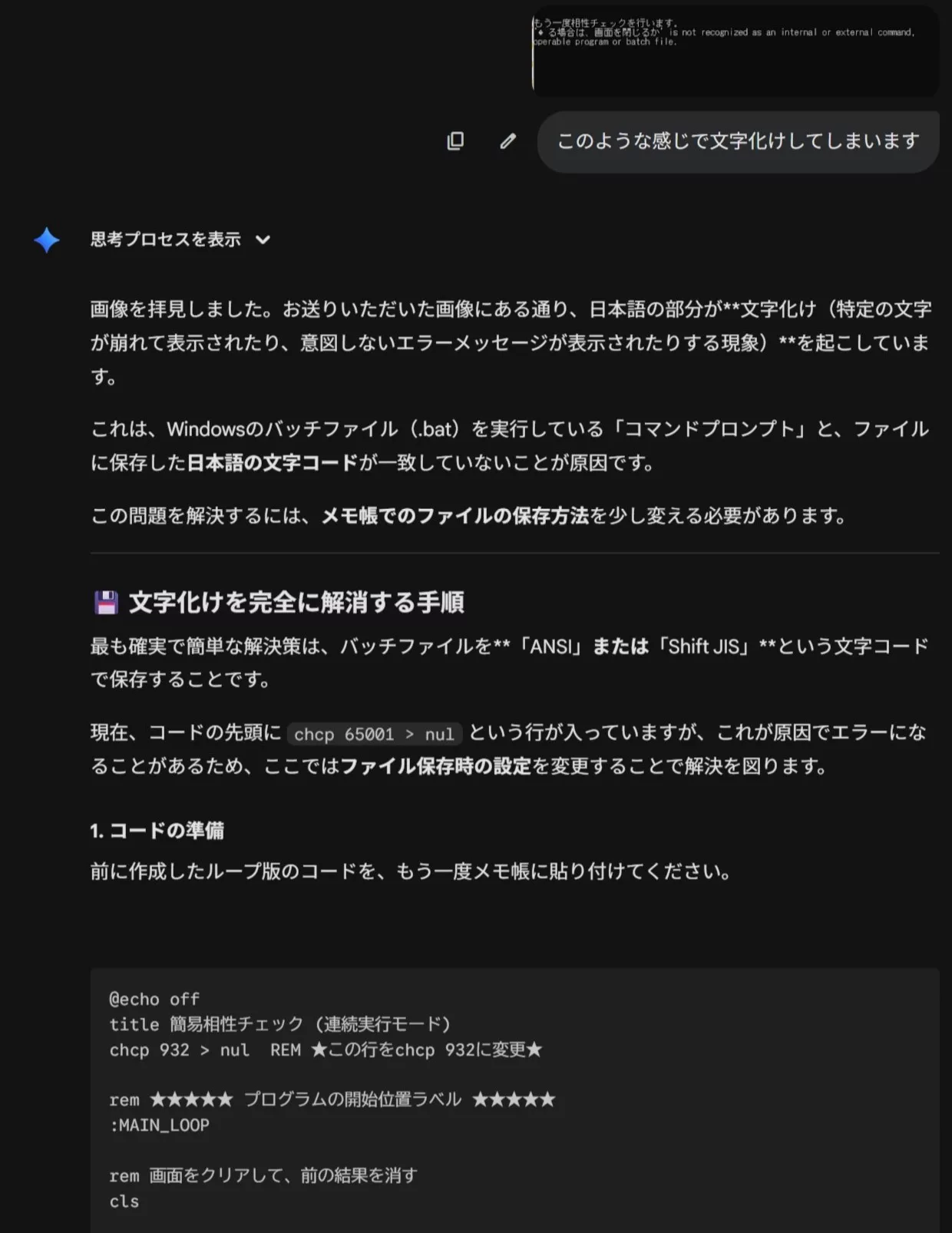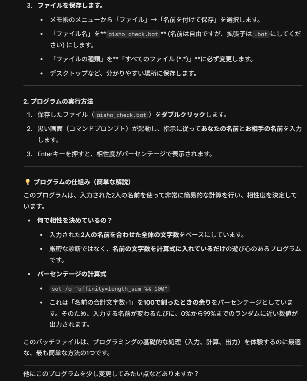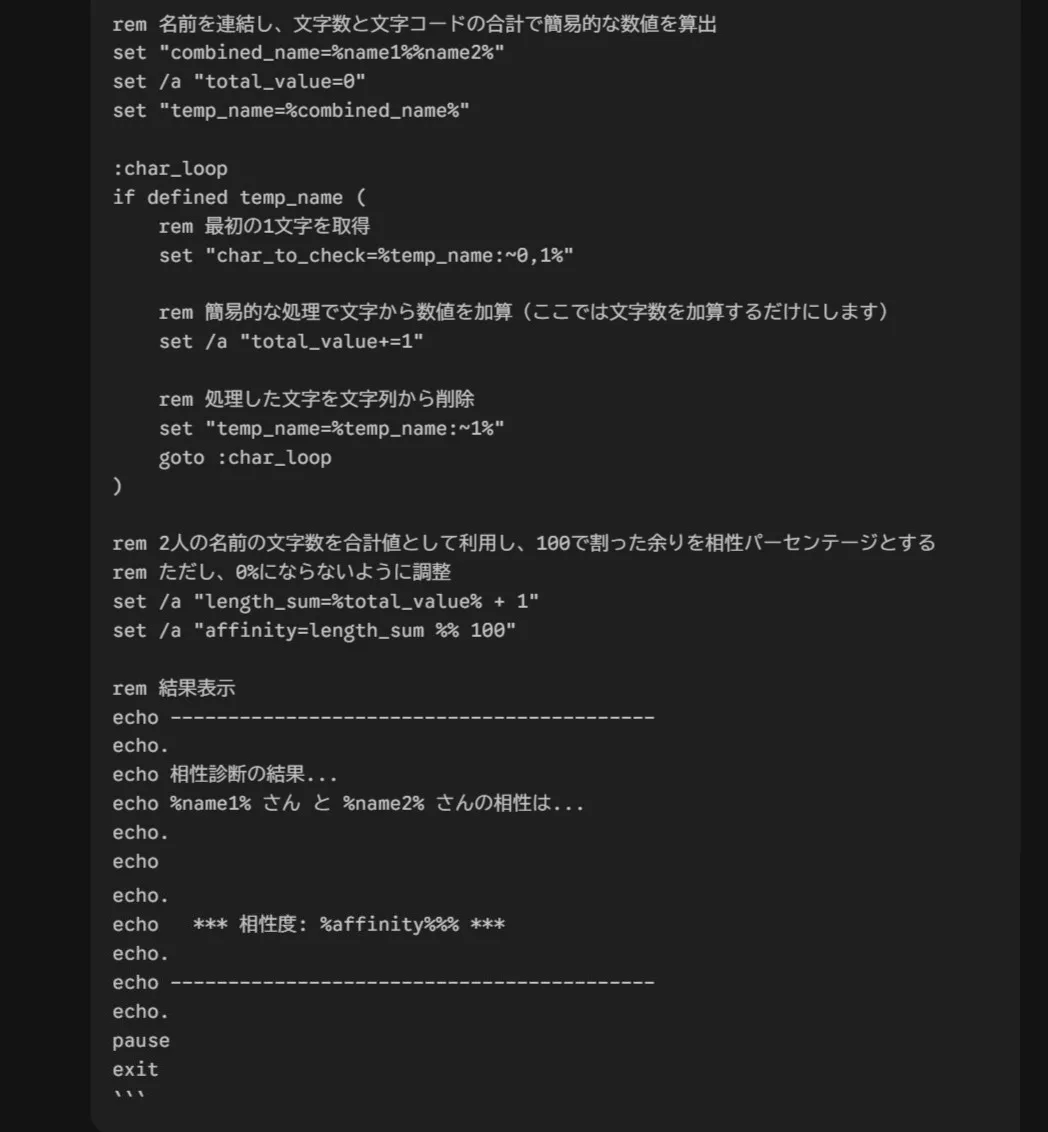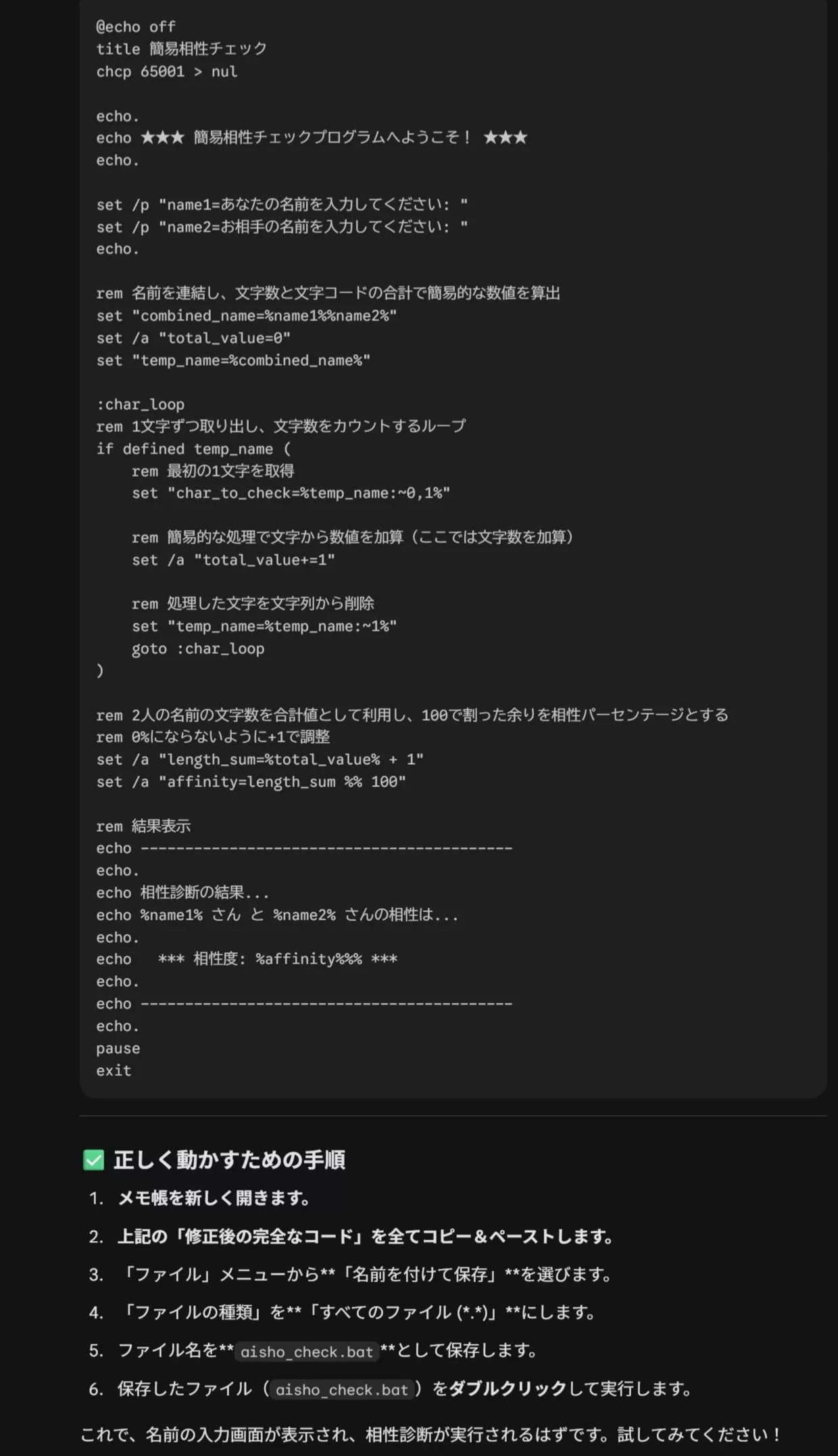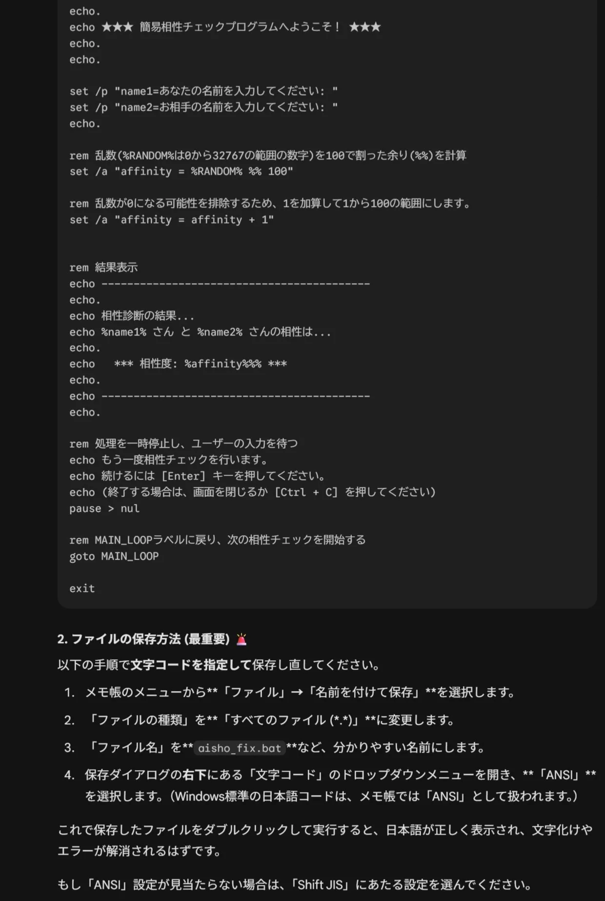 今回でいうと、メモ帳にこのコードを貼り付けてbatファイルとして保存してね、そうすると黒い画面が開くからそこで相性チェックできるよ、とのことでした。