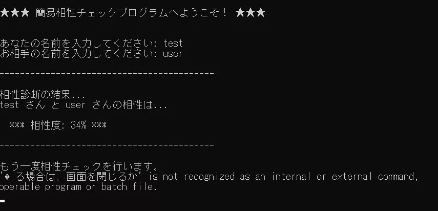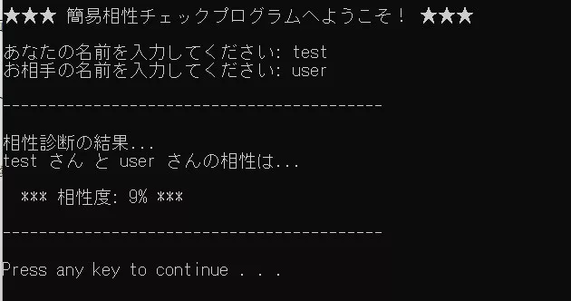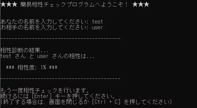 無事プログラムを実行し、相性の診断もすることができました!(ちなみに一瞬開いて消えてしまうのはローカル環境のセキュリティの問題でしたので、コードのミスとは別枠の問題でした)