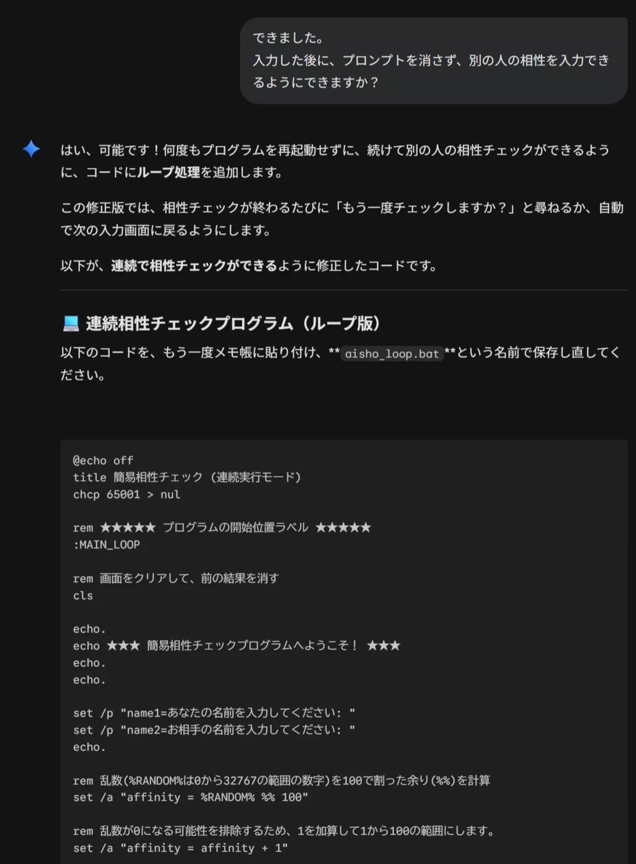 そこで今回は、プログラミング経験ゼロの私が、Geminiという強力な生成AIを相棒に迎えて、実際にプログラミングに挑戦してみた体験談を共有させていただきます。なお、至極簡単な相性チェックプログラムを初心者が作成してみたという記事になりますので、プログラミング経験者の方は温かい目でご覧いただければと思います。