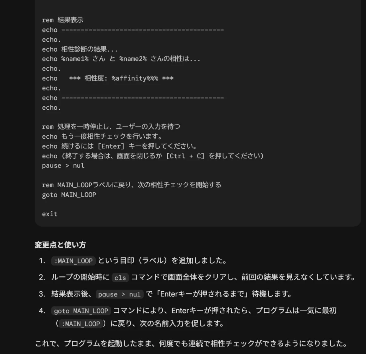このプログラムを使ってみたのですが一回相性診断で結果が出た後になにかキー入力をした場合は画面が閉じてしまう仕様となっていたため、画面を閉じずに繰り返し入力できるように改良を加えることにしました。