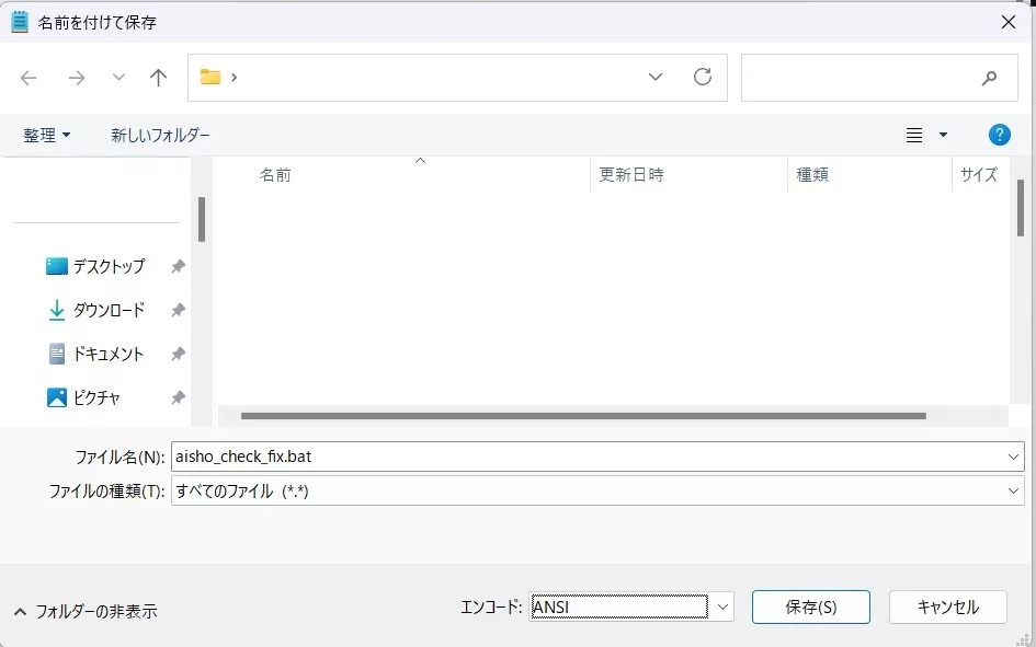 文字コードが問題な可能性があるから、「ANSI」形式で保存をしてみてほしいとのことでした。言われた通りに設定をかけ保存。