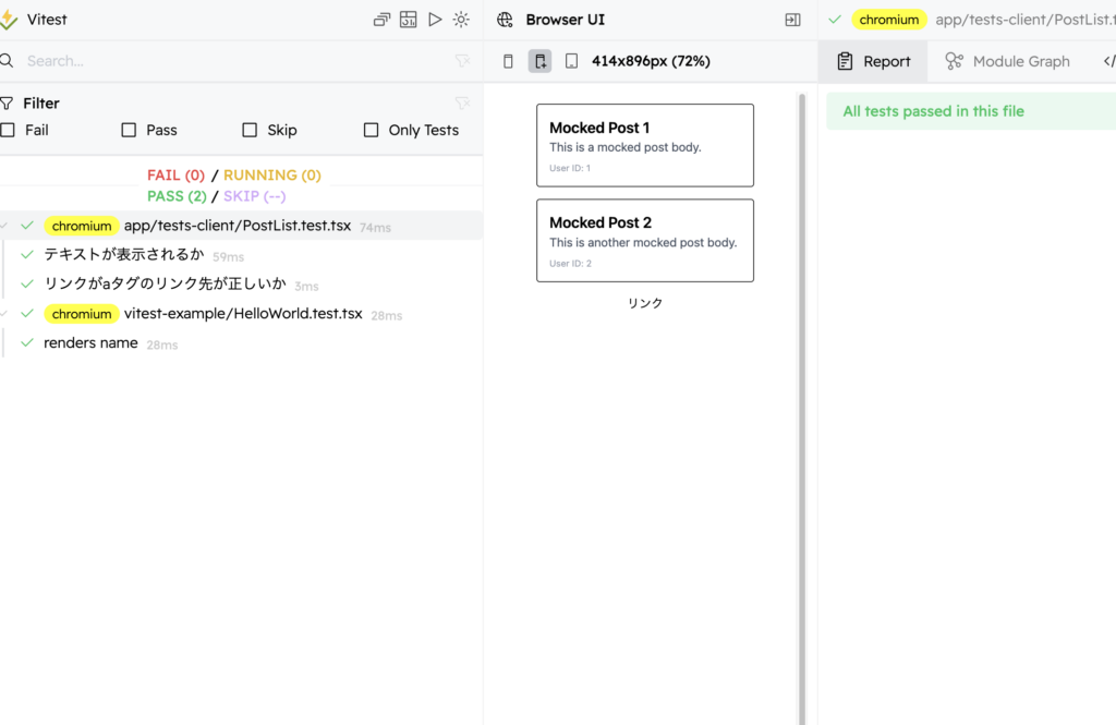 npx vitest --browser=chromiumすると PostList のテストケースは成功したことが分かります。