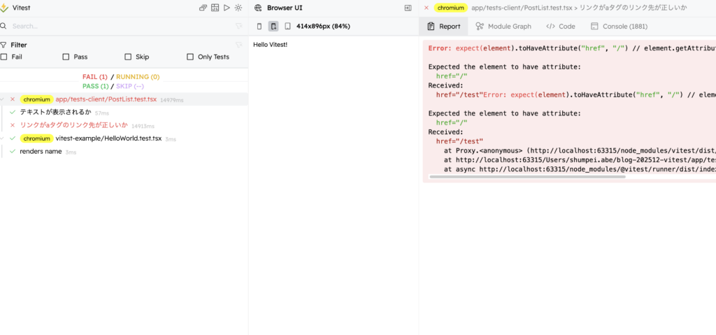 });それで再度テストコードを実行して、確認すると、ターミナル上でもエラーが出ていますが、ブラウザ上でもエラーを確認できます。